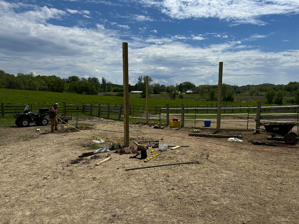 Posts are standing straight up, and the two spots along that line are open, ready, and waiting for the new tall posts to go in.