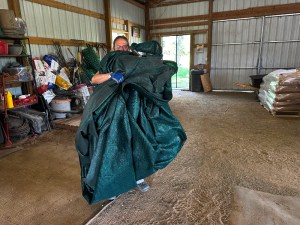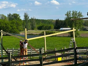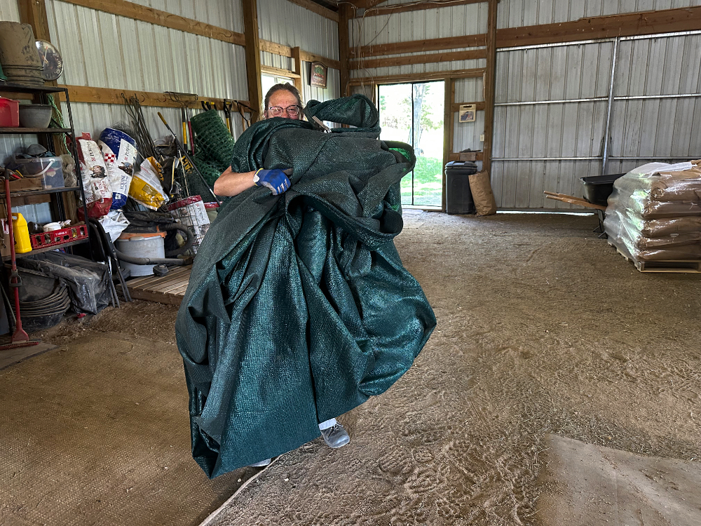 When all four posts were vertical and Justin got the eyebolts in place, it was time to retrieve the sail from the barn.