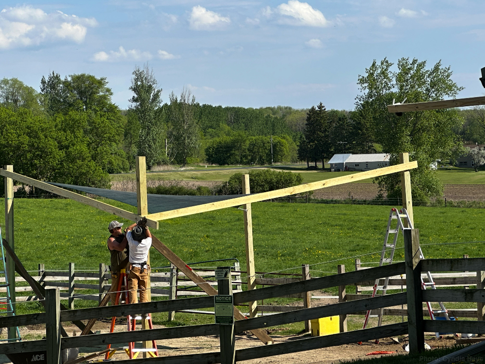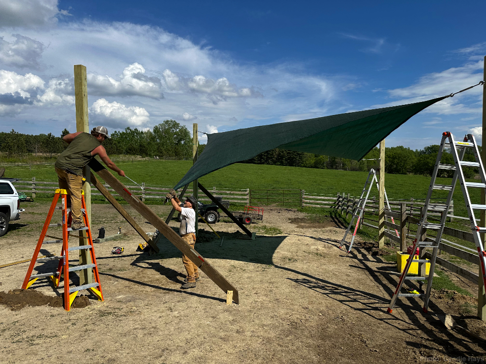 It was a really long day in the hot sun, which made it all the sweeter when the sail went up, providing some very welcome, precious shade. I think the horses are going to find this to be a very nice addition to their living quarters.