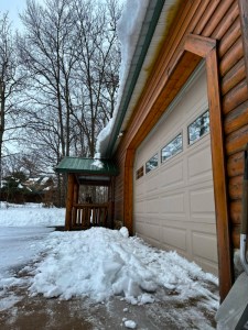 The roof of the shop garage is not a concern for ice dams so I don’t pull snow off with a roof rake. However, it is a metal roof and the snow eventually slides off on its own. After the rain and warm temperatures of the past few days, the thick blanket of snow began moving enough that a large amount broke off and covered the cement apron in front of the garage door.