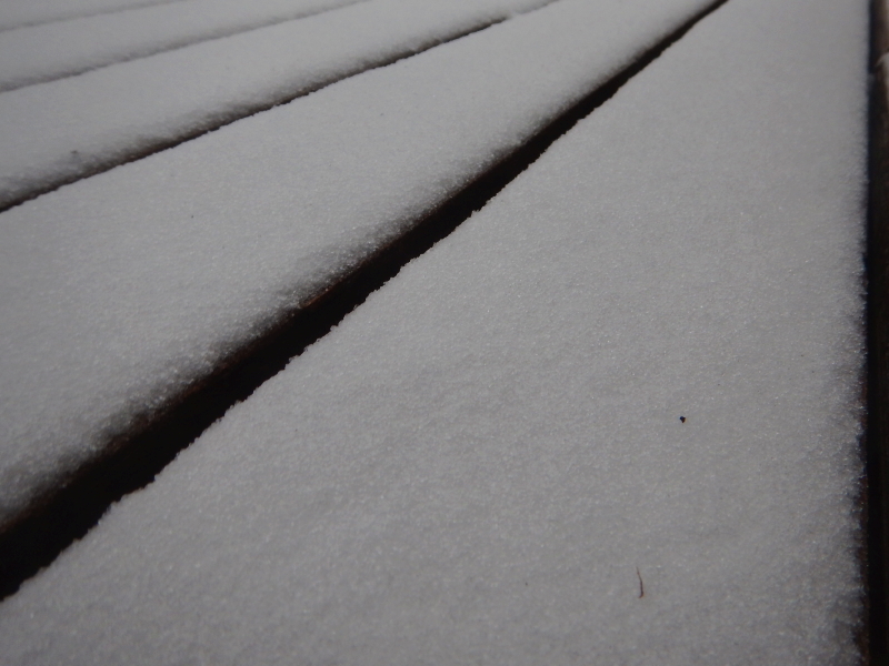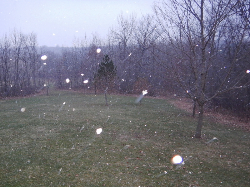 We knew it was coming, so when snowflakes started to fly, we didn’t make much of a fuss over it. While Cyndie was in the middle of a phone conversation, I noticed her gesturing to direct my attention toward windows. The rain was changing over to sleety flakes.
