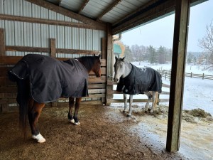 After a few days without blankets, I covered the horses back up on Monday while they were dry to give them some protection from the wetness that arrived yesterday. Now, just because they have blankets on, that is no reason to become heedless of the elements.