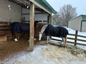 It felt and looked like rain, but a large percentage of it was the little ice balls. The ground was becoming a frozen glaze. I knew the horses deserved to come inside before they got soaked and chilled by it, so Delilah’s walk was delayed a bit, while I tended to horse chores.