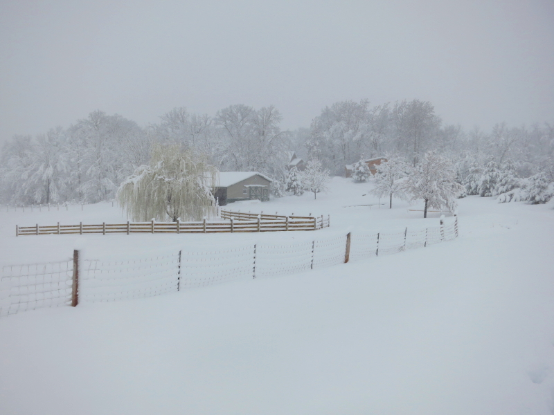 Cyndie had put the horses inside the barn Thursday night in anticipation of the snow’s arrival, which had been predicted to start out as rain. We checked the radar several times that evening, for an indication of the timing of the precipitation’s start, but even though it appeared to already be snowing overhead, it was actually still dry outside on our grounds by the time we went to sleep.
