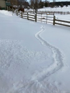 Imagine this: Delilah and I were on another walk around our property. How many times have we done that before? Regardless the frequency of our travel on the variety of paths available, there is always something new to discover. Yesterday in the quickly fading light of day, it was snow and marks in the snow that caught our attention.