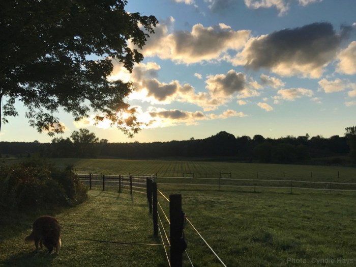 The morning light coming over the eastern horizon bathes our property with such picturesque hues. Yesterday, Cyndie captured how the smooth, freshly mowed hay-field looked as she and Delilah made their way around to open the chicken coop and tend to the horses.