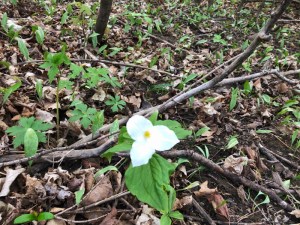 The photo on the left above is an example of new shoots appearing beneath the one with the flower, which excites us with hope that more could result in the future. The image on the right is an example of a lone trillium with little else of any variety seeming to flourish much.