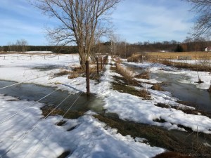The air temperature probably hit 50°F for a bit, resulting in water flowing as if there was an actual river along our southern property border, not just a swale that sits dry most of the time.