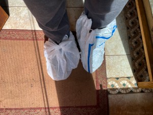 Looked like crime scene booties to me. The tedious hassle of getting in and out of boots for a quick indoor trip finally drove her to bag the boots and forge ahead. Works in a pinch but I don’t think it will be the solution for having a dog living with us again.
