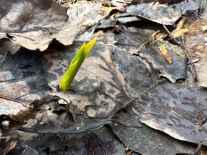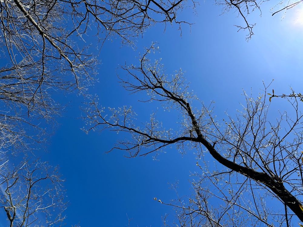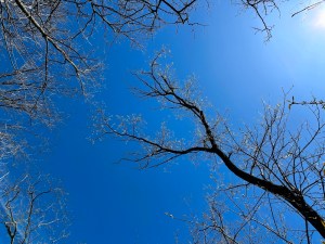 We are beginning to see hints of color on the tops of certain trees on the horizon. Many shrubs and bushes at eye level are sprouting tiny new leaves. Looking straight up, signs of life appear at the ends of high branches of tall trees. It won’t be long before we have trees with leaves again.