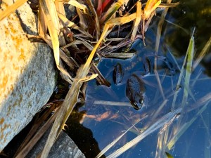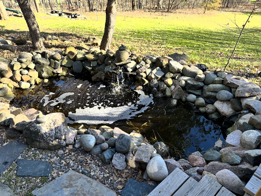 He kept it up after the net came off, as if thanking us for our service. Much of the time he was near impossible to spot but eventually, he swam out into the open and floated for a while. As Cyndie worked a net and rake to clean out old reeds and residual floating debris while I wrestled to position and hide the pump, filter, and tubing among the rocks.