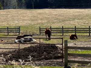While I was tending to compost piles mid-morning, I looked up and found three of the horses on the ground napping with Light standing watch.