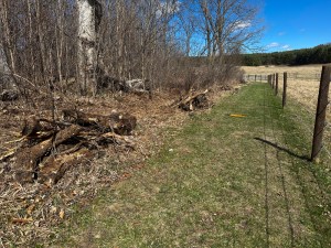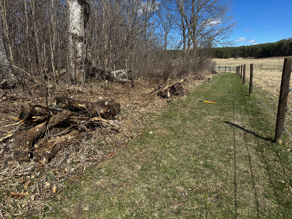 I made piles that must now be hauled away from the lane around the back-pasture fence. Anything dry can be run through the chipper, but the rest will be tossed onto the natural fence wall where we just piled all the willow branches we cut down on Monday.