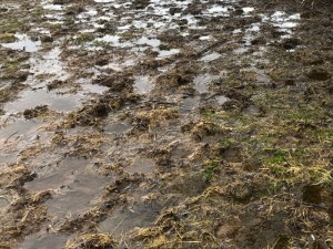 Well, the top layer has thawed just beyond the overhang and it is now a muddy, mucky mess. The water can’t soak into the ground because the next layer down is still frozen solid. Water is just standing in hoof-sized pools.