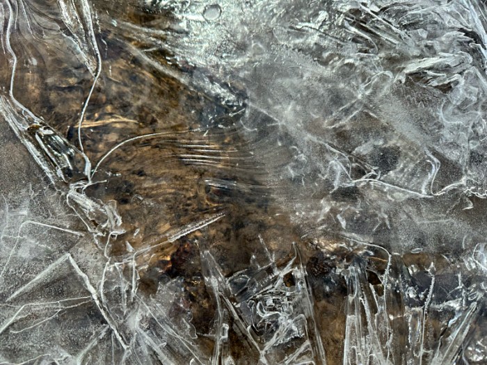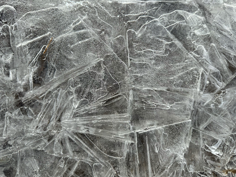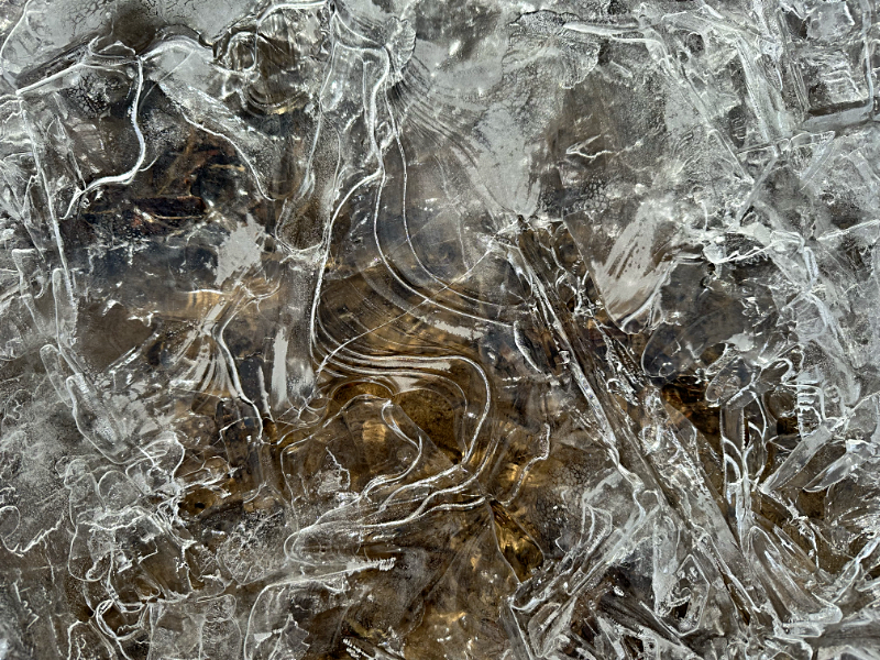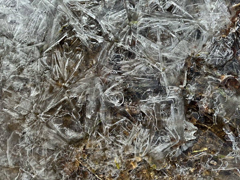 With the oscillations of our temperatures rising above freezing during the day and then dropping below each night, a morning walk offers a variety of artistic spectacles. Icy designs form over the water that was flowing in the drainage ditches. The artwork is only temporary because as the earth spins to move our view of the sun higher in the sky, the ice turns to water and flows downstream.