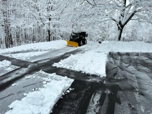 Because the snow was sticky, I resorted to a fair amount of hand shoveling in areas where I couldn’t run the ATV at a good speed to get the snow to slide off the angled blade. That made for some heavy shovel strokes where the plow had rolled up big blocks of plowed snow.