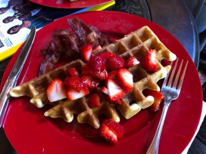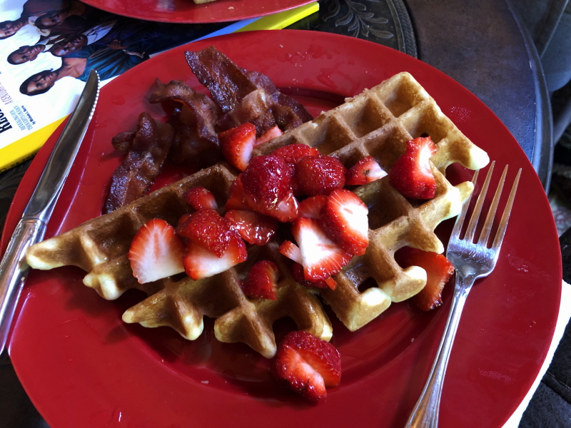 Cyndie and I departed after a luscious crepes breakfast and headed toward home. On the way, we stopped to visit the farm of my niece, Liz, and her husband, Nick, and their kids. We met their new dog, and their pigs, and toured their garden. The strawberry patch was loaded with a thrilling amount of ripe berries.