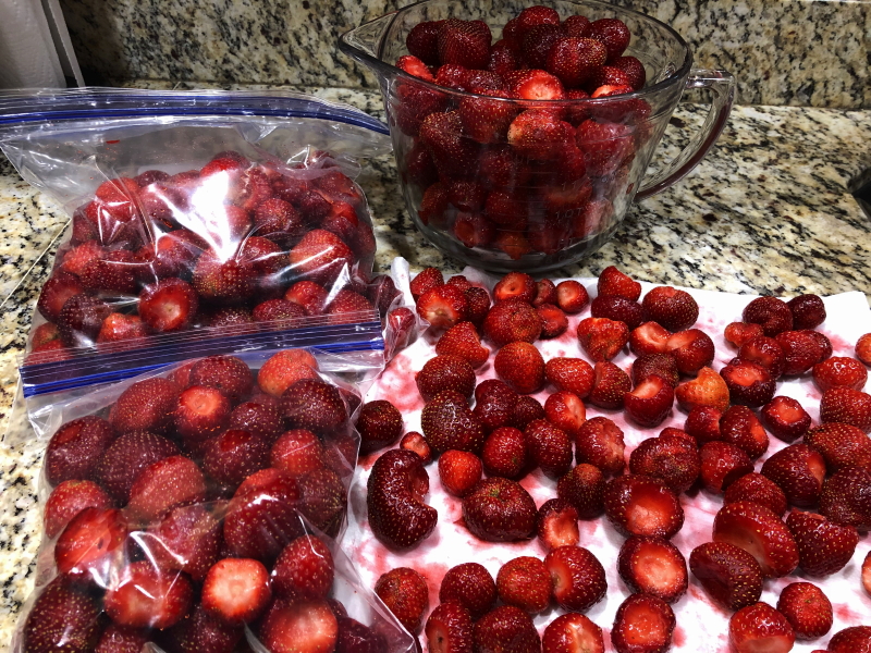 When everything seemed done for the day, I found Cyndie in the kitchen making strawberry jam from the final batch of last year’s frozen berries. I guess seeing her strawberry plants already showing signs of life when she was putting up the fencing around them spurred her into action.