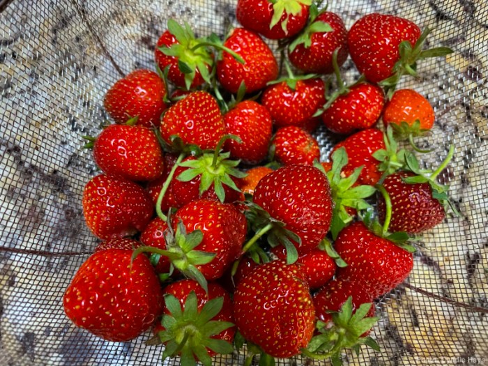 We came home with a rich bounty. Cyndie was wondering if her strawberry patch might also have berries ready to be picked.