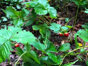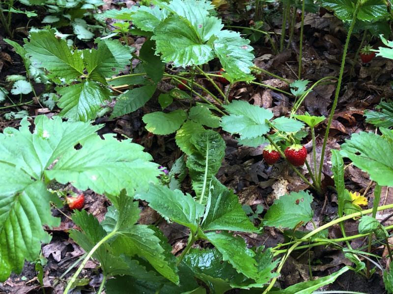 The jewel weed is looking about as happy as we’ve seen it in years. It’s hard to tell which of the two plants wants to spread out more: the strawberry patch that Cyndie’s trying to rein in or the wild jewel weed.
