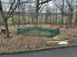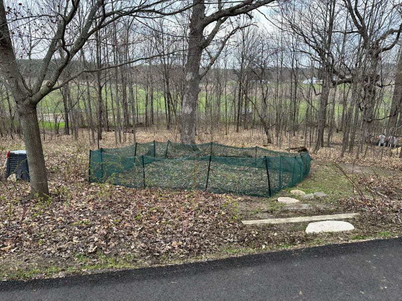We are certainly giving a lot of attention to our labyrinth to have it ready for visitors on May 6th, but several other projects need timely attention. Spring growth does not wait for any of us. Raspberry canes are sprouting new leaf buds already. The red raspberry patch at the bottom of our backyard hill was munched by deer last year so Cyndie wanted to take a stab at protecting the plants in advance this year.