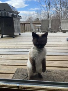 We knew instantly that there was a visitor on our deck by Delilah’s reaction. I spotted the good-looking Siamese running by the door in our bedroom as Delilah bolted to the living room doors to fire up her most ferocious outburst at the scary beast threatening her sovereignty.