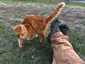 The neighbor’s cat didn’t bother to acknowledge our presence. Since there was no sign of animosity between the two, I set the dark orange stray down in their yard and started walking back to our place, hoping it would stay and the two of them would keep each other company.