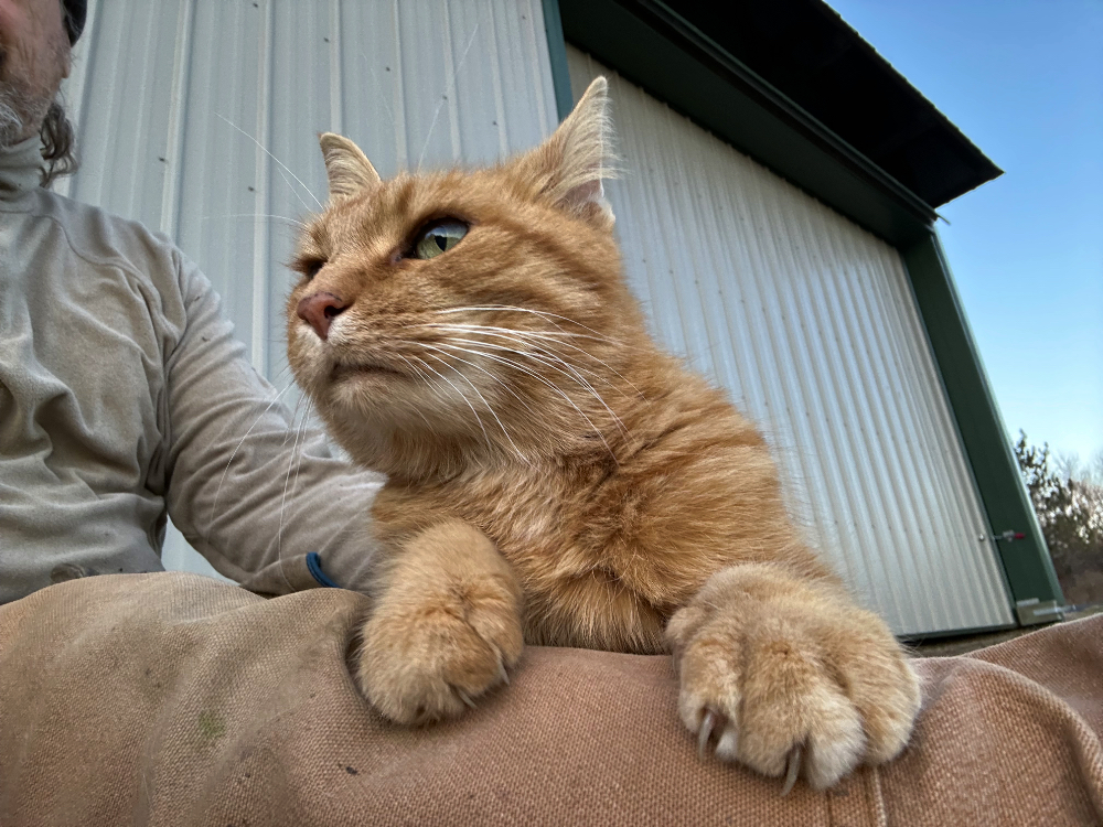 I didn’t get very far when it became clear the stray was going to follow me all the way back. I sent Cyndie a photo of the cat on my lap and asked her to bring down a cat carrier. When I went into the barn to retrieve the feed buckets, the cat followed.