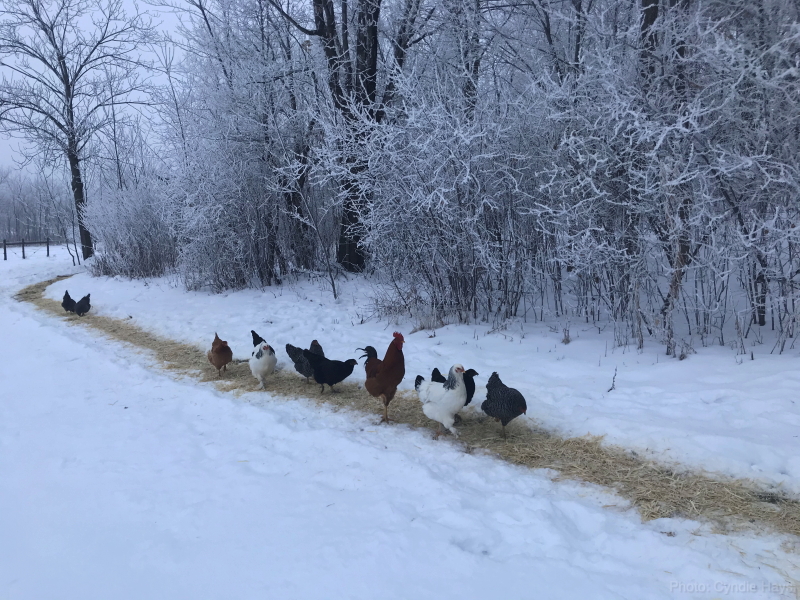 While I pushed to let them figure out for themselves that they can walk the packed snow pathways to get to the dry earth under the barn overhang, Cyndie preferred to provide them a straw surface on which to tread.
