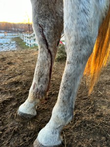 Yesterday afternoon, while serving up pans of feed for the horses, I noticed blood on Mix’s leg.