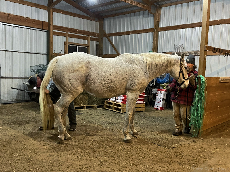 I moved horses around and closed gates to isolate Mix from all three of the others so she wouldn’t need to do any hasty retreating. The vet finally arrived long after dark, but he quickly analyzed the wound and administered meds. I drove Cyndie down to the barn and she used crutches to come in and observe.