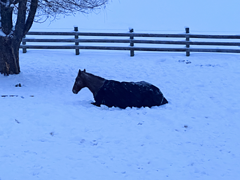 It was snowing heavily but there was no significant wind yet. That is predicted to start later today. I don’t know if the horses have a sense of the blizzard that is about to hit but conditions are expected to get much worse for them.