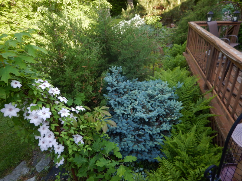 Just beyond our deck, the previous prominent low spruce is getting swallowed by ferns from behind and volunteer cedar trees from the front. The clematis on our trellis is being crowded out by a volunteer maple that decided to make itself at home there.