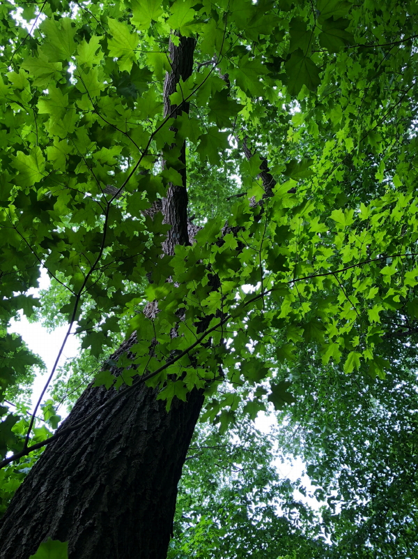 Since it hurt too much to lift my left leg enough to do any pedaling, and it was hot as a baker’s oven outside in the sun, Delilah and I spent most of our walks yesterday in the woods. With all the leaves back in force, it feels a lot more like what I think “forest bathing” is all about.