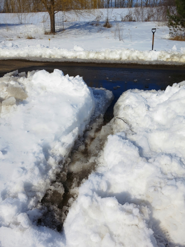 That brought me to my highlight of the day: I got to play like a kid, making a channel through the snowbank and ice on one side of the driveway, to allow a big puddle that formed in the low spot, to drain. For that being a legitimate issue needing attention, it sure was a fun one to remedy. Breaking ice to make water flow is one of life’s simple pleasures.