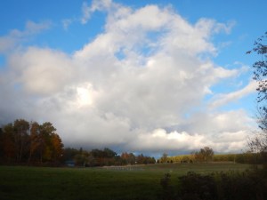 Halfway through the woods on our way around toward the barn to feed the horses, I fumbled to stash my sunglasses in a vest pocket. The sky was filled with clouds.