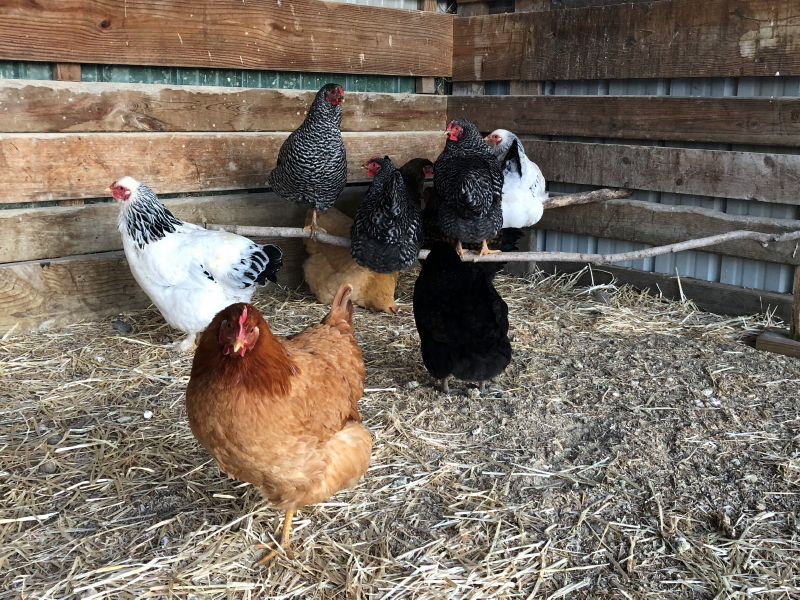The bite of the pre-dawn chill had many of our chickens looking to get their feet off the cold ground as they huddled in the corner where the sunshine will first arrive when it makes its way above the treeline. We’ve propped up a couple branches for their benefit. I noticed two of the Domestiques chose to balance impressively on one foot on the wobbly perch so they could keep the other foot tucked up inside their feathers for warmth.