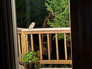 Tuesday night as we were falling asleep, our motion light over the deck popped on. I saw a flash of wings moving up by the light and then the little night stalker landed on the railing. Surprise! It was a young owl.