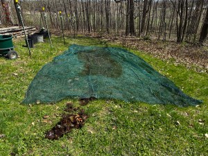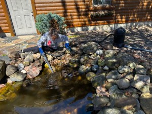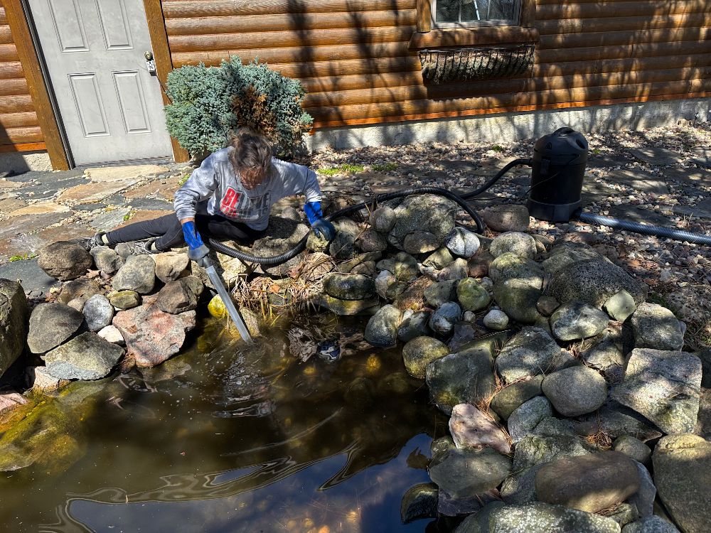 After a little rest to allow my nerves to wake up, Cyndie and I took on the work of bringing the landscape pond out of hibernation. Putting a net over the pond to capture fallen leaves has been a great way to make spring clean-up easier.