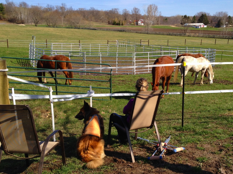 Then it was back to work, toiling away on tasks in the vicinity of our temporary fence so we could watch how the horses would adjust to the new area opened up to them. We were so occupied with our tasks, we barely got in a wave goodbye to Elysa and friends, as they departed up the driveway after an afternoon visit with the horses.