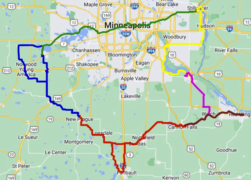 This being the 50th anniversary of this middle-of-June biking and camping week and my 25th (+/- my first year was 1994, but I missed a few throughout), I am thrilled at the switch from the far reaches of the state –over the years we’ve slipped into every state around Minnesota plus Canada– to a route that will take us directly through the middle of the Twin Cities of Minneapolis and St. Paul.