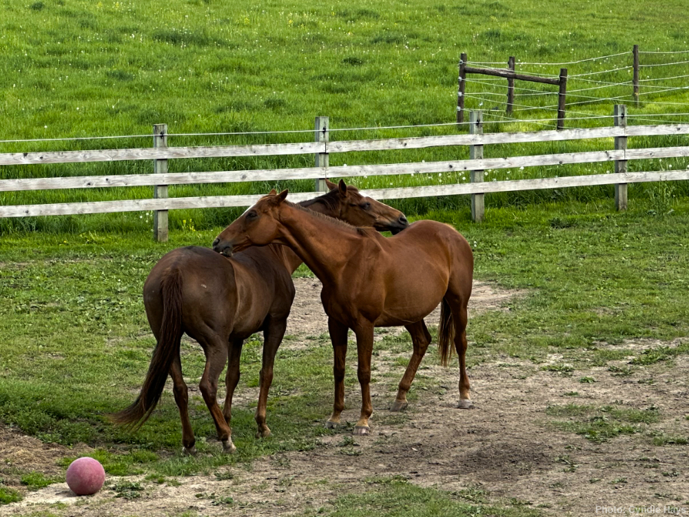 We said goodbye to the Rails-to-Trails in the driftless region around Sparta yesterday and made our way home. I am very happy to be writing on my laptop again instead of my phone. The horses look to be in great spirits. Cyndie sent me a picture of Mia getting some nice attention from Light as they practiced a little mutual grooming.