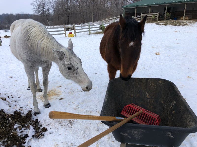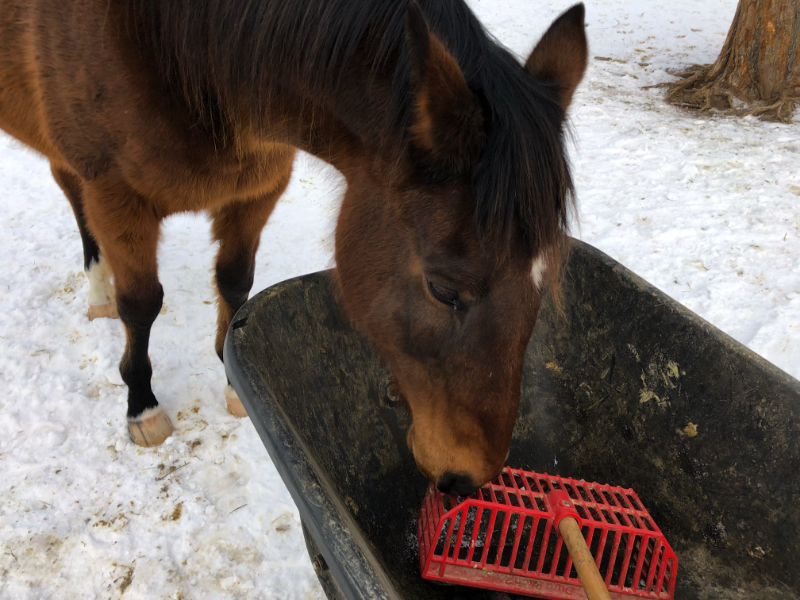 Lately, when Cyndie or I move around her to scoop poop or hang hay nets while she is gobbling from her feed pan, Mix will sharply swish her tail or pin her ears back and swing her head in our direction to flaunt her command over her food. We have been verbally responding with our disapproval and carrying on with our task at hand to show her she does not direct our activity.