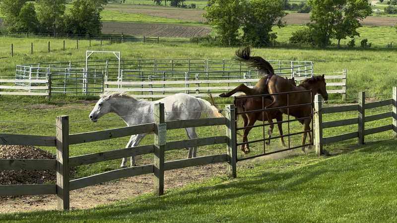 Mia was nearby but wasn’t the least bit perturbed by the shenanigans Mix and Light were up to. After two more episodes of flailing hooves, the herd quietly and methodically made their way out into the hay field as if nothing had happened and settled into some grazing.