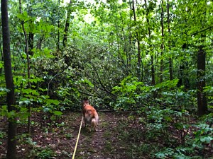 When morning arrived and I got Delilah out for her first walk of the day, we quickly arrived at the first evidence of the intensity of the storm. The top of a tree with a 12-inch diameter trunk snapped clean and came down across one of our trails.