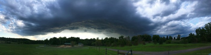 The other wildness we have been enjoying was in the sky. Cyndie snapped this panorama as a thundering shower loomed large over the ranch.