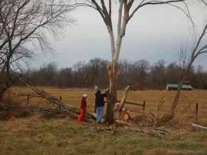 We agreed on the time to stop working on individual limbs and take a crack at bringing the whole thing down, but there was still a lot of wood standing.