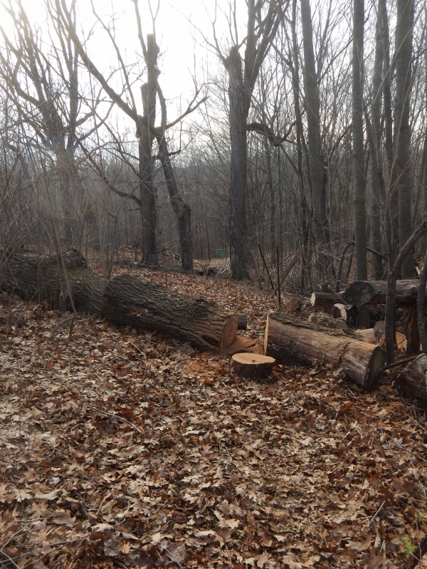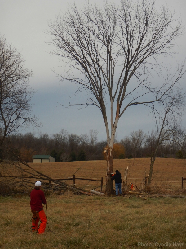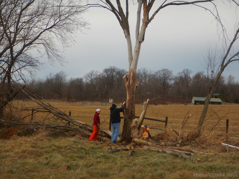 We agreed on the time to stop working on individual limbs and take a crack at bringing the whole thing down, but there was still a lot of wood standing.