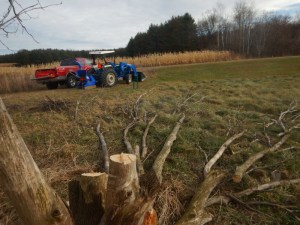 Since we have a wealth of branches to be run through the chipper in that area, I’m planning to bring the tractor back there anyway, so I figure the hydraulic power of the loader might be the solution to moving the heavy sections of that tree trunk.