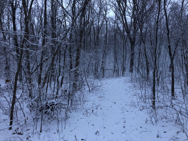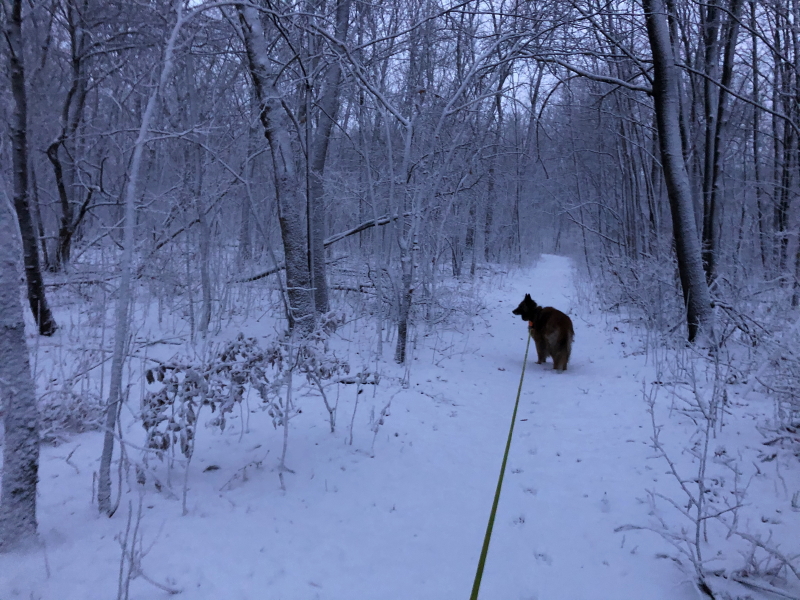 A little over an hour after the precipitation had turned to snow, Delilah and I were traipsing along the main perimeter trail through the woods and I noticed the view ahead was much different than the view behind us.